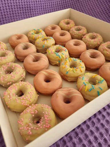25 יחידות של מיני דונאטס אפויים מצופים במלא שוקולד במגוון צבעים וקישוטים לבחירה.