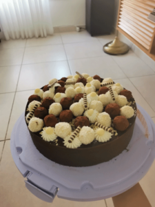 הכינו גנאש שוקולד לציפוי העוגה אבל חכו עם הציפוי. הכניסו את הגנאש למקרר למשף כחצי שעה עד שהוא התייצב ונעשה בצורת ממרח שוקולד והתחילו במריחה. פעולה זו תגרום להדבקת הממתקים בצורה יותר קלה ופשוטה.